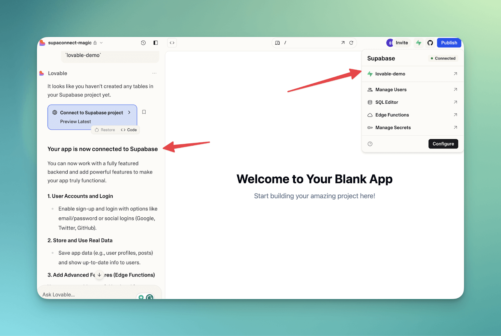 Once you create a new project, Lovable will confirm you have successfully connected your app to Supabase.