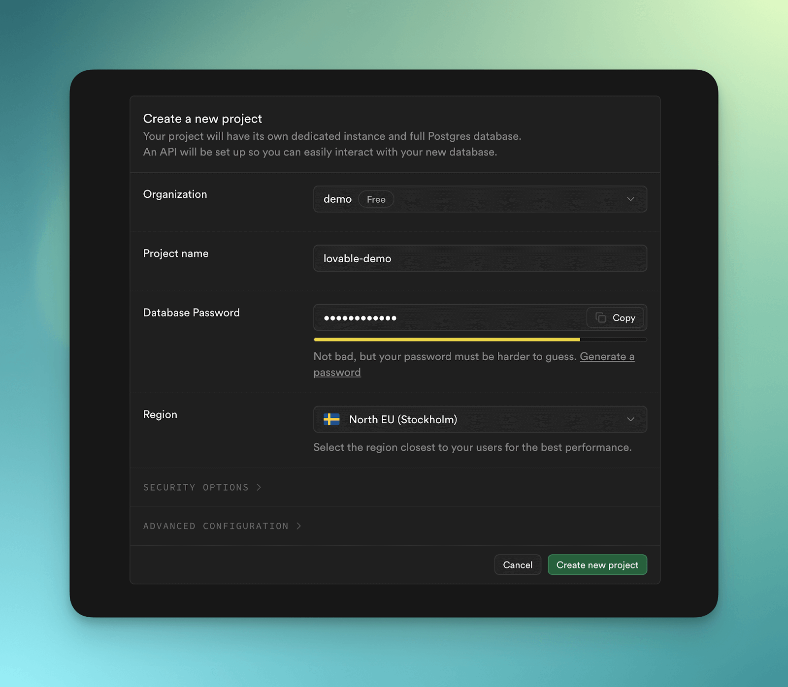 To connect your Lovable project to Supabase for authentication, database, and backend, click on click on the Supabase icon in the upper-right corner of your project. Then, enter a project name, password, and choose the region closest to your recipient.